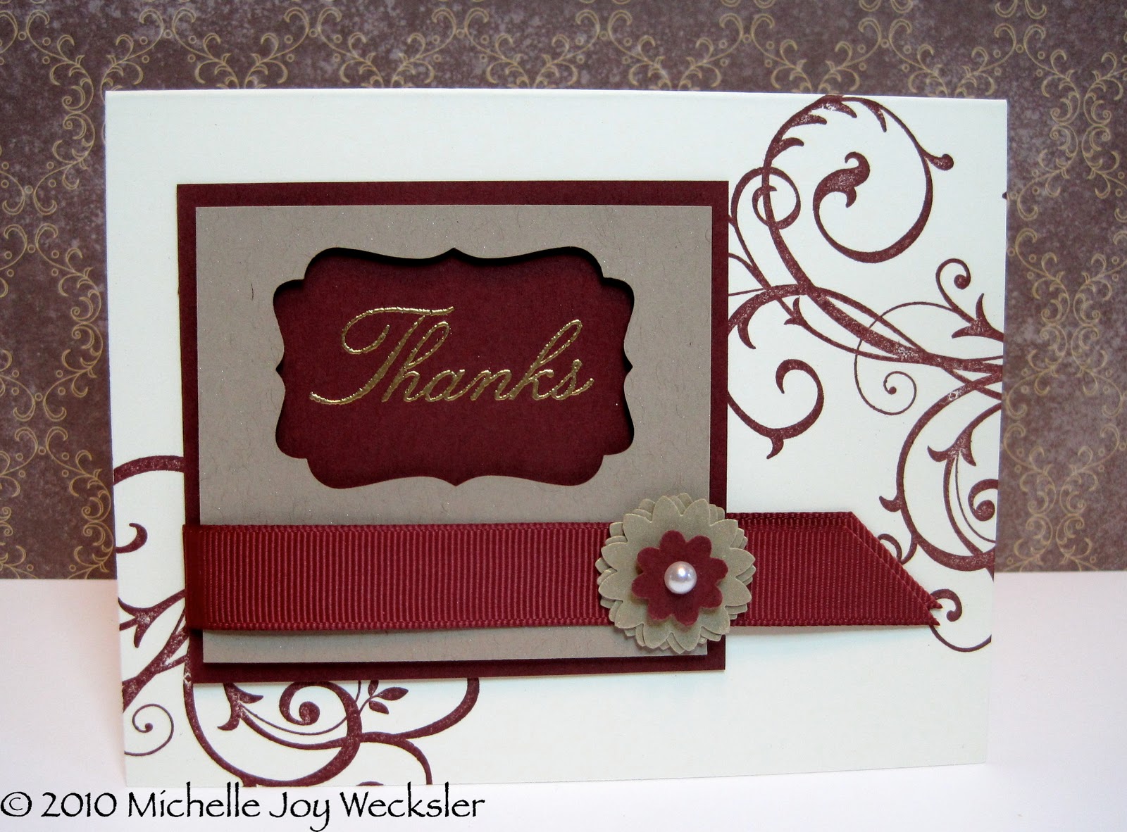 This piece of punched Crumb Cake card stock was unearthed from the pile on the craft table the other day and it definitely spoke to me! I decided the extra-large Decorative Label punch makes a great window for greetings! I stamped the greeting from the Afterthoughts hostess set, with Versamark ink, onto Bravo Burgundy card stock and heat embossed with gold embossing powder. The Crumb Cake window was sprayed with a mix of alcohol and champagne shimmer mist paint (a great alternative for smooch spritz - it is incredibly economical and can make tons!). I used dimensionals to pop up the window and then added some Bravo Burgundy 5/8" ribbon. The flower was made by punching brushed gold card stock and Bravo Burgundy card stock with the Boho Blossoms punch. I layered 3 of the gold flowers and glued them together and then added the burgundy flower with a dimensional and topped it with a pearl jewel. Stamping the flourish image from the Baroque Motifs stamp set providing the perfect background for this unique window! I hope you like it! What scraps do you have lying around????