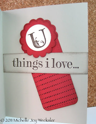You can use your Bingo Card stamp to make an adorable card for Valentine's Day or just to say "I love you!" Here I stamped the image using Early Espresso ink and added some more stamped images from the Tiny Tags stamp set. The "love" hearts are from the I Heart Hearts stamp set and are popped up with dimensionals. Inside the card there's more fun...